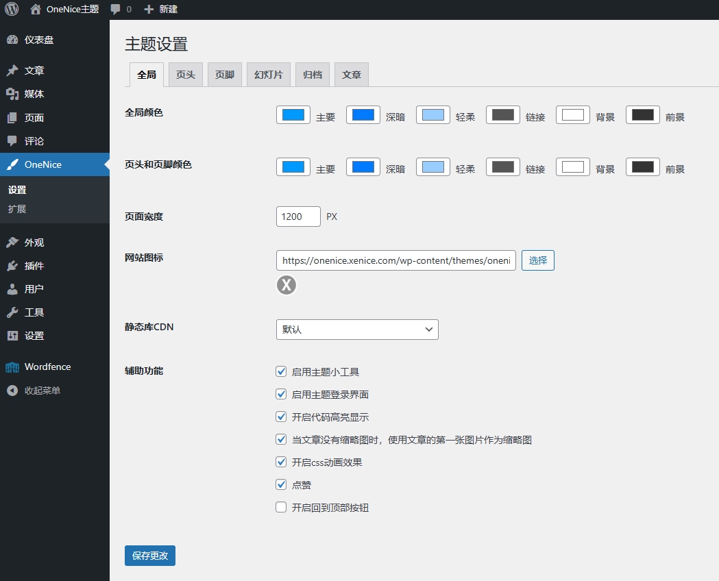 - 主题启用时会自动导入主题配置默认值,点击后台左侧菜单 OneNice> 设置,可根据需要对主题相关信息进行修改。