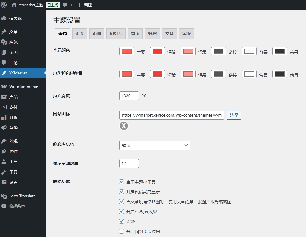 - 全局选项 全局颜色、页头和页脚颜色、静态库CDN、页面宽度、网站图标。